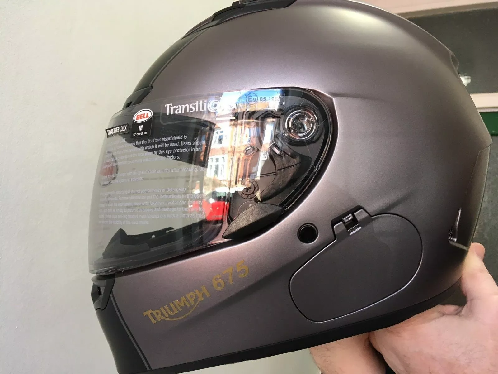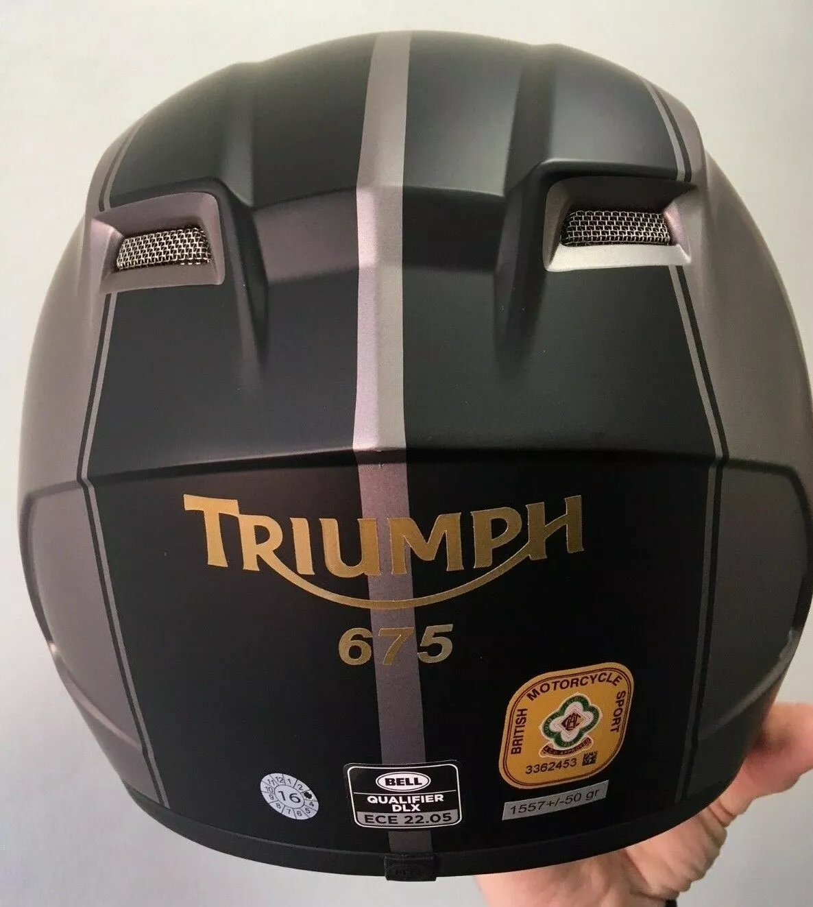 “with Triumph 675 stickers in Gold applied to the helmet, this is not lacquered over but we do it free of charge the stickers”
