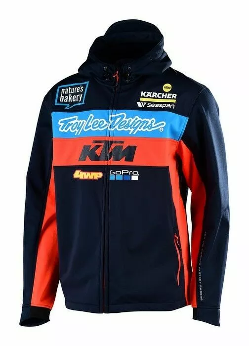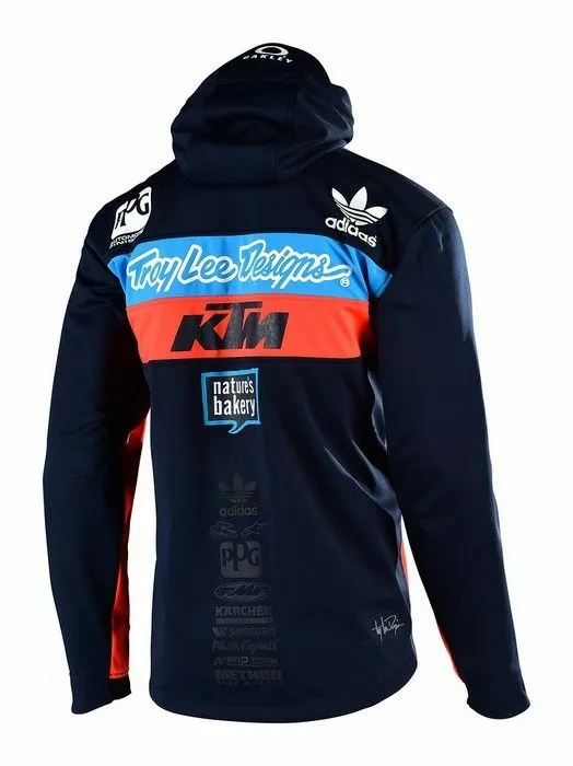 Fans will look “Factory” thanks to the TLD/KTM Pit jacket. The three-layer bonded softshell hooded design goes on easy with its front zipper and looks extra sharp with its TLD/KTM colours and branding. The 100% Polyester fabric is also Teflon-coated for water resistance, helping you stay warm and dry when the temps drop or the rain falls at the moto track or wherever you want to rep for Team TLD/KTM